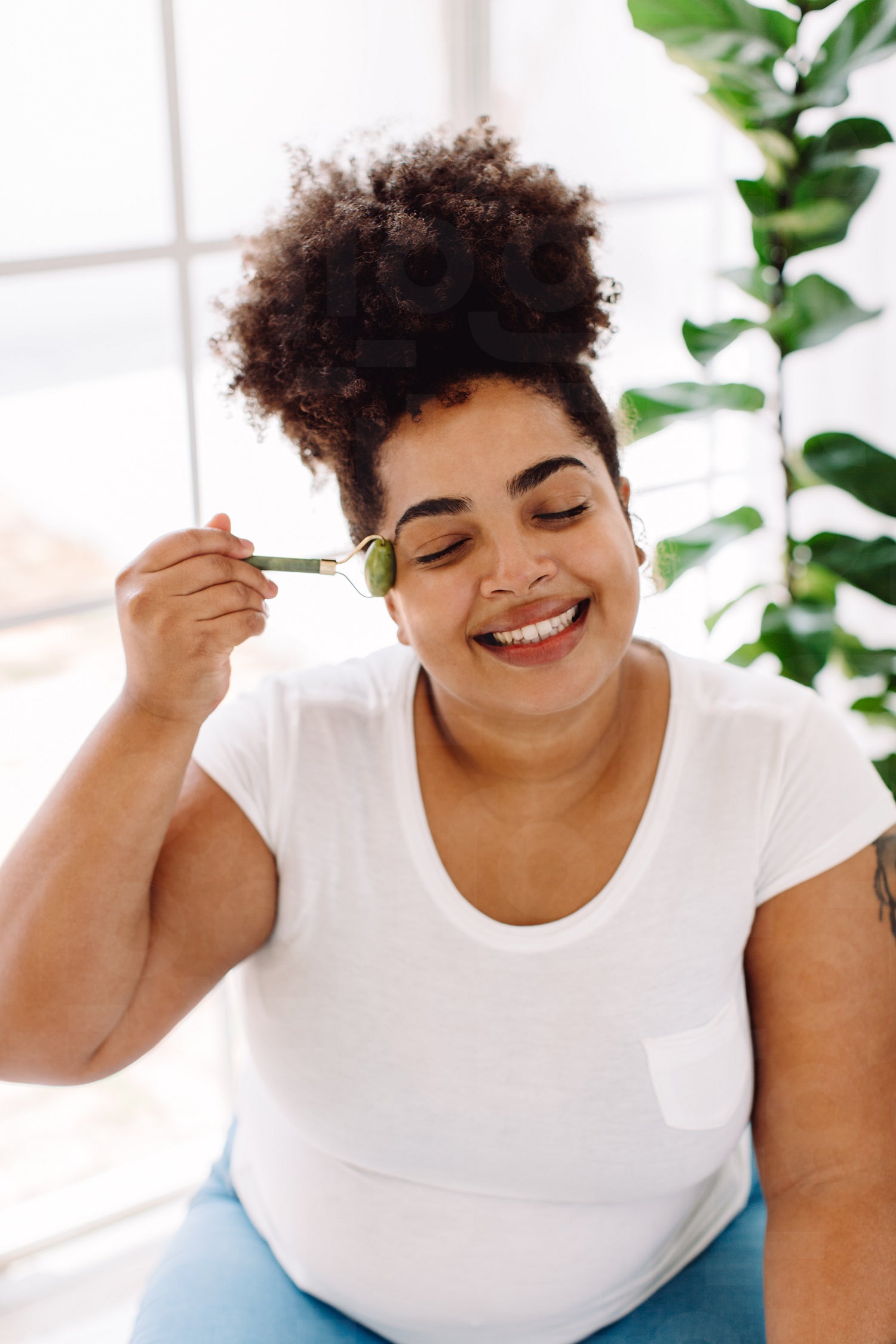 Attractive woman massaging face skin with jade roller. Woman using beauty tools for self care.