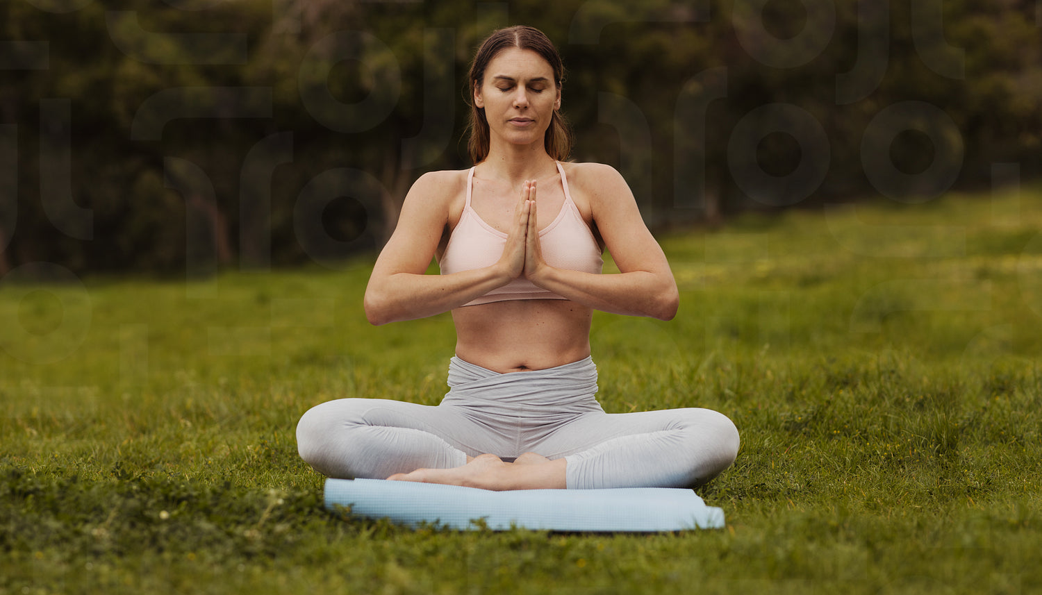 Fitness woman sitting in a yoga pose in a park. Woman practising yoga sitting in a park with palms joined together.