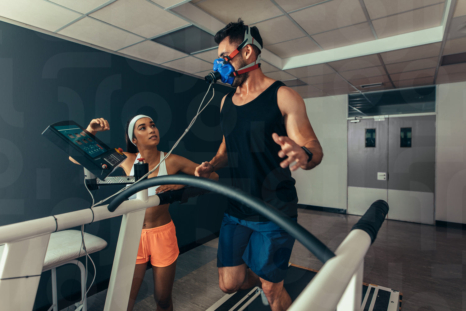 Runner with mask on treadmill in laboratory with woman standing by. Woman monitoring runner with mask on treadmill in laboratory