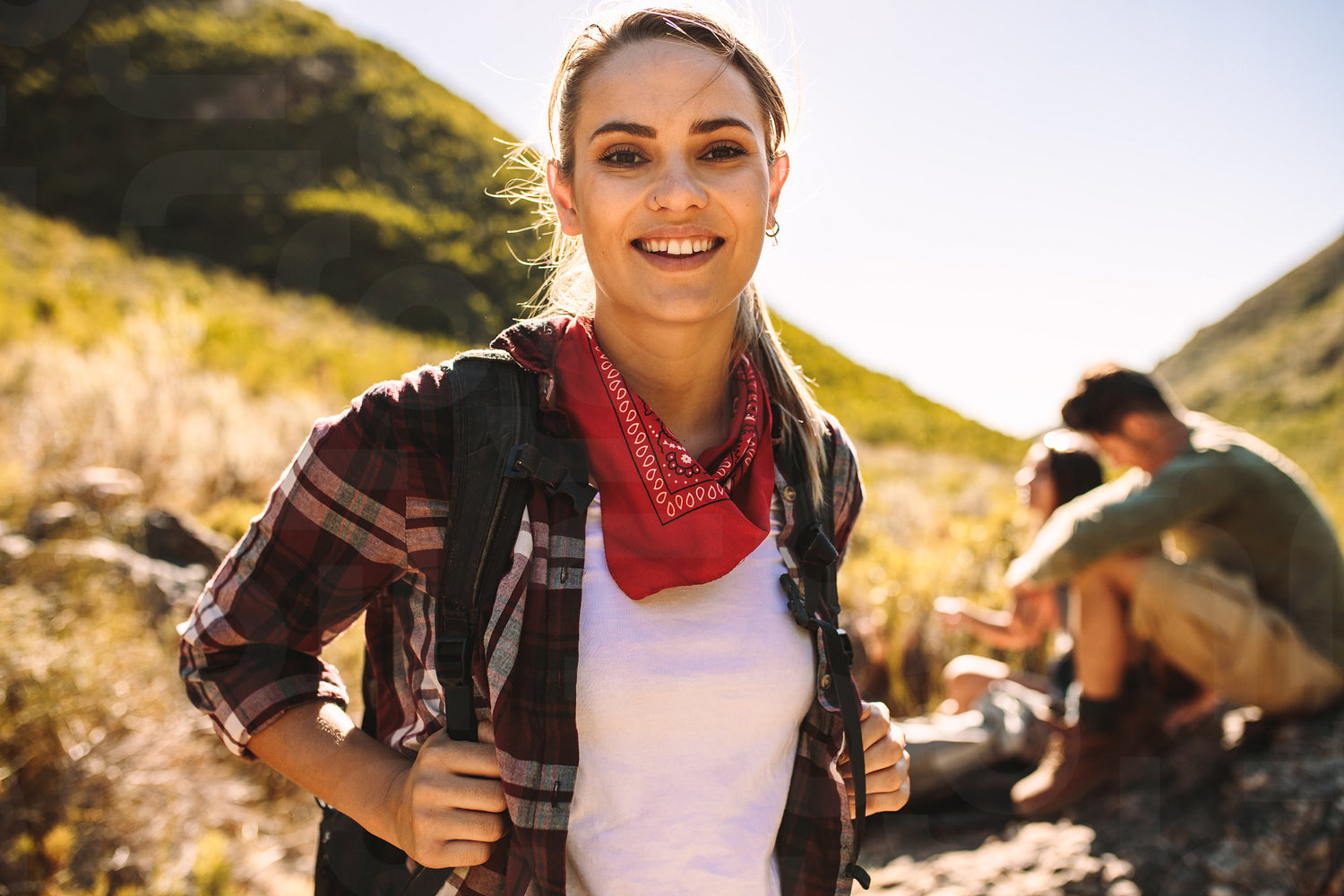 Portrait of beautiful young woman with friends sitting at back while hiking in countryside. Woman on a hiking trip with friends.