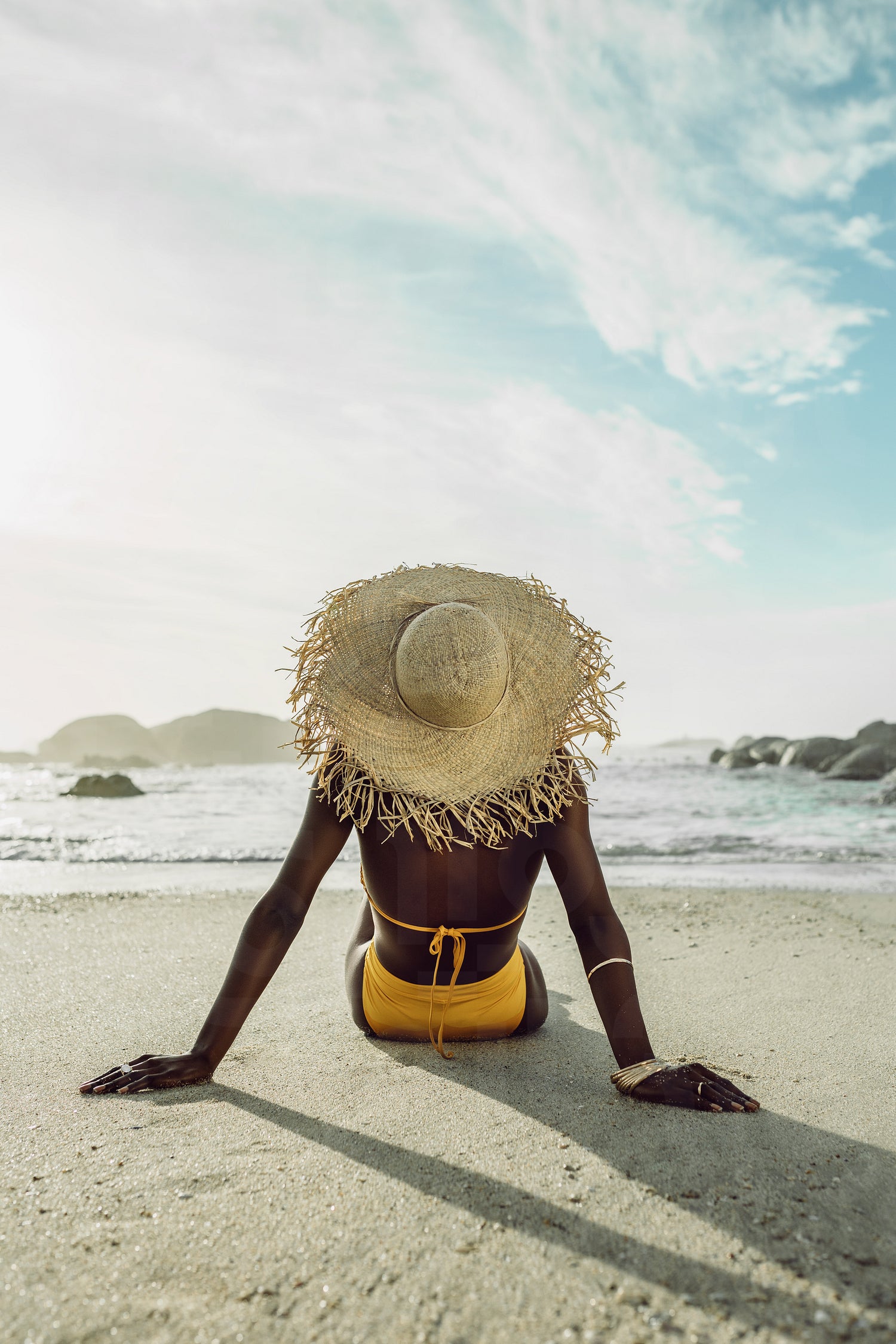 Rear view of a woman relaxing on beach. African female model in bikini wearing a straw hat on sea shore. Woman on beach vacation.