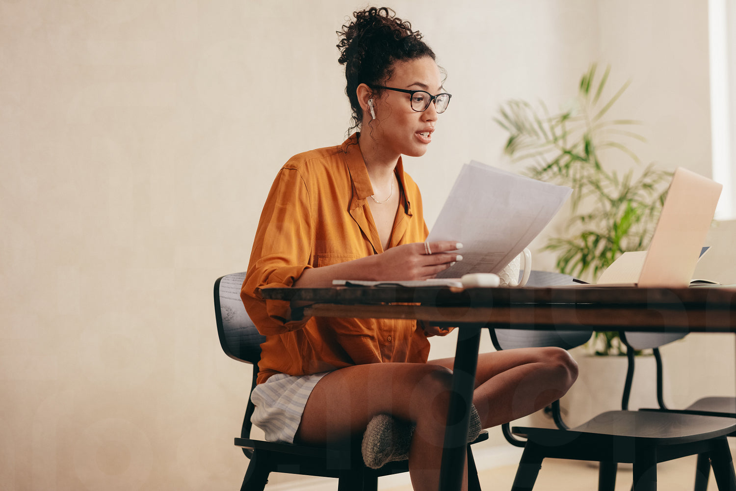Businesswoman holding documents having a video conference call on her laptop. Woman working from home having a video call meeting.