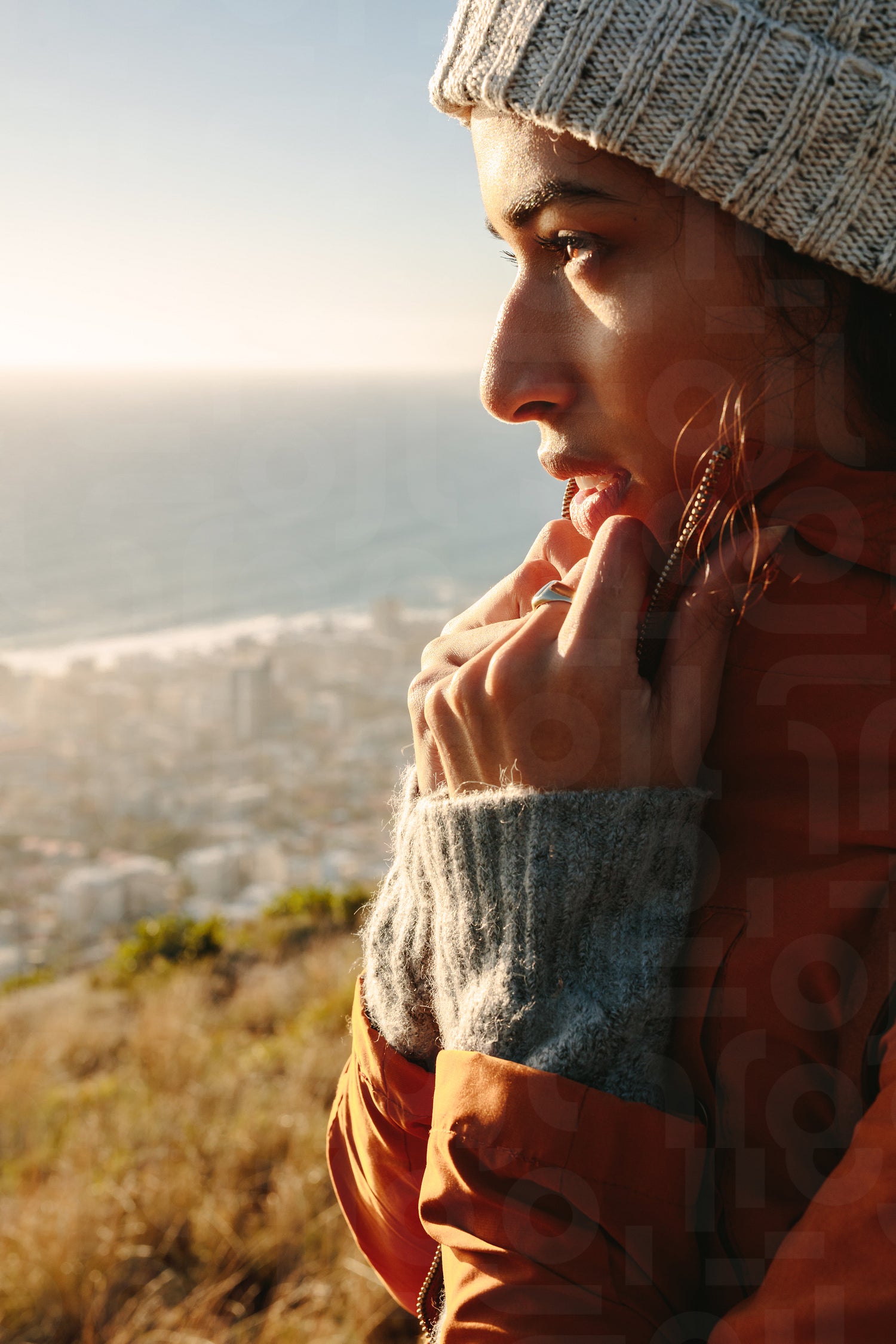 Close up side portrait of woman in winter wear looking at view outdoors. African female wearing warm jacket and knitted cap admiring the sea view in winter day.