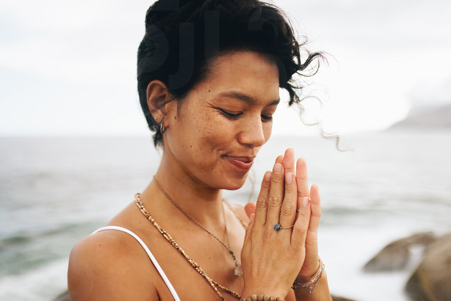 Woman in a peaceful meditation pose at the seaside, practicing yoga and prayer with wavy hair and bohemian jewelry.