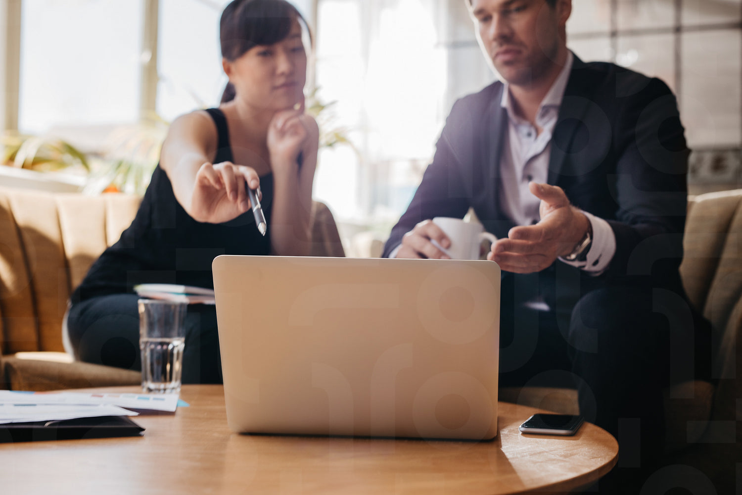 Shot of young woman presenting business idea on laptop to businessman. Executives meeting in a office lobby discussing new business ideas.
