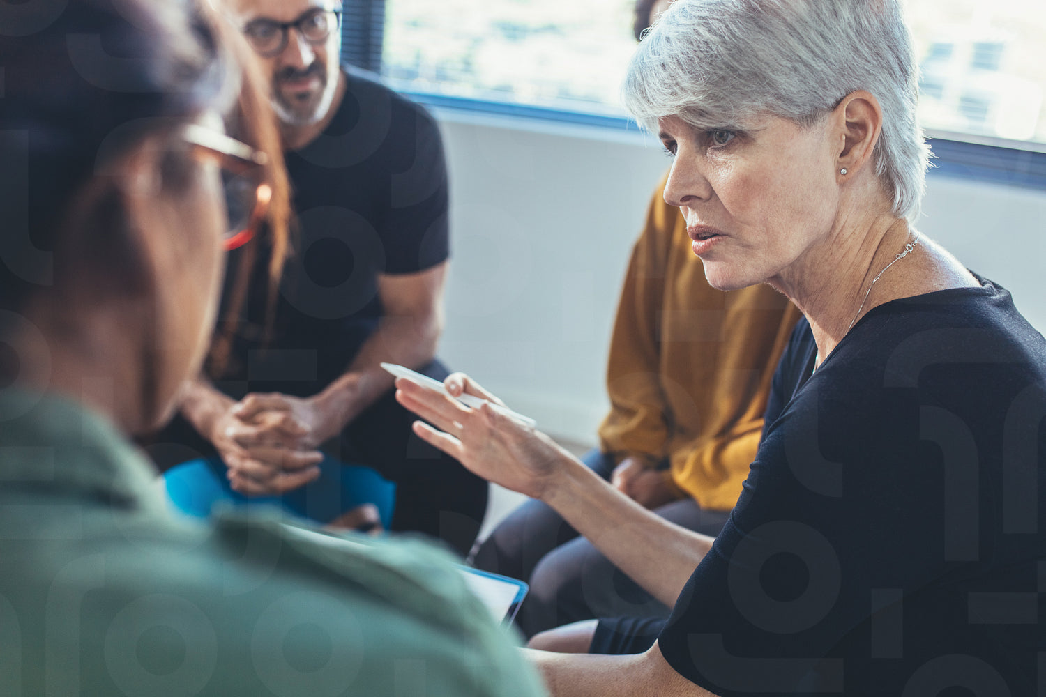 Mature female business professional talking to the team in a meeting. Group of people sitting together having a discussing in office.