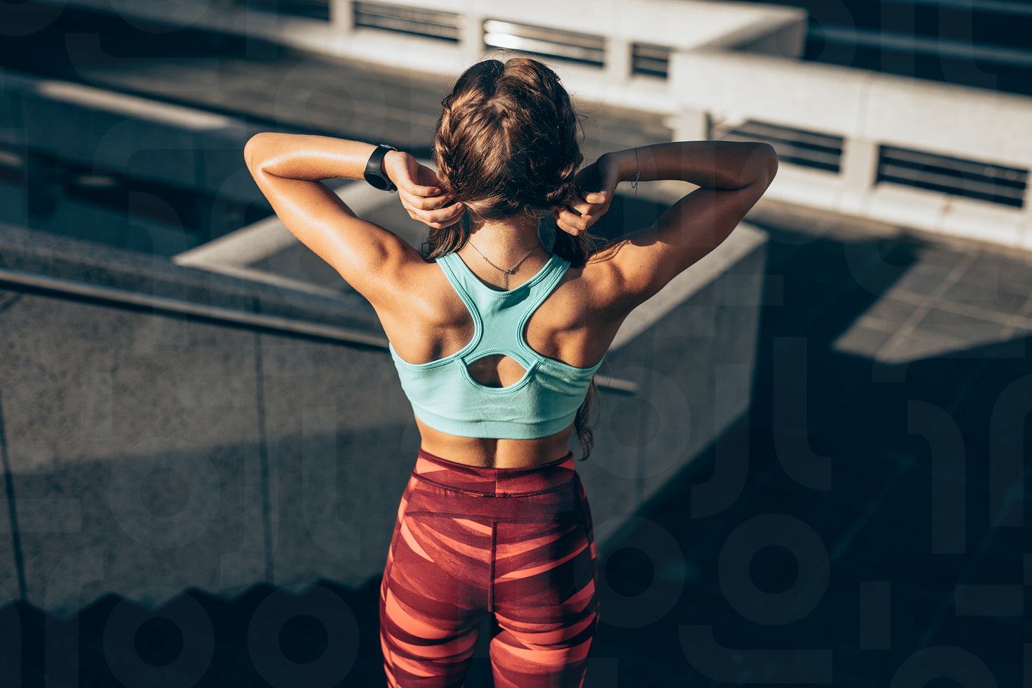 Rear view of fit young woman in sports clothing standing on steps in morning. Female with muscular body ready for workout outdoors.