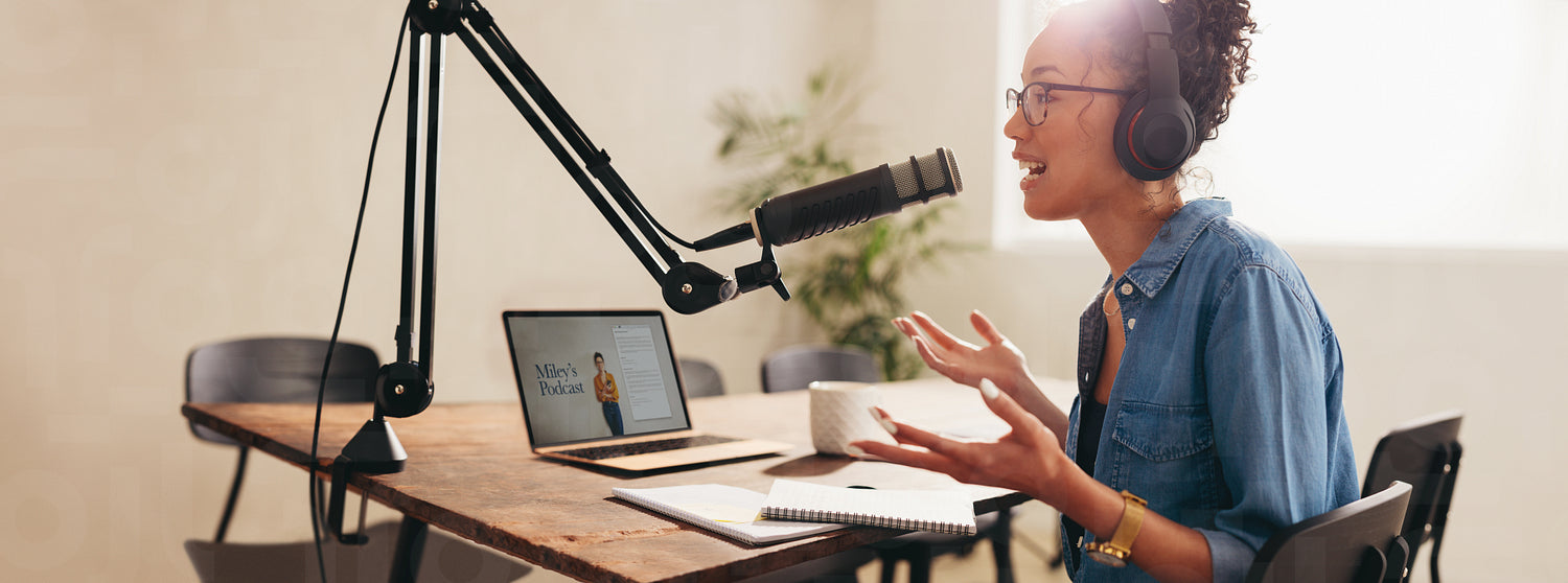 Woman recording a podcast