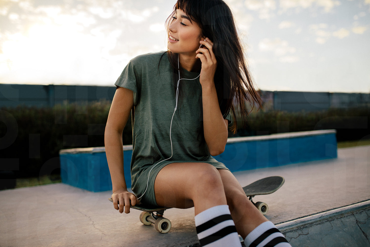 Young woman sitting on the skateboard adjusting her earphones at the skate park. Urban girl relaxing at skate park listening music.