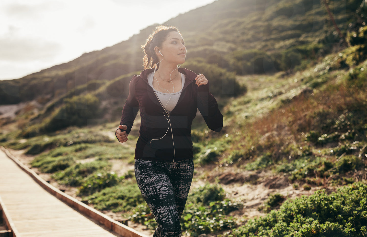 Woman running outdoors and looking at the view. Female doing jogging exercise on path by the mountain.