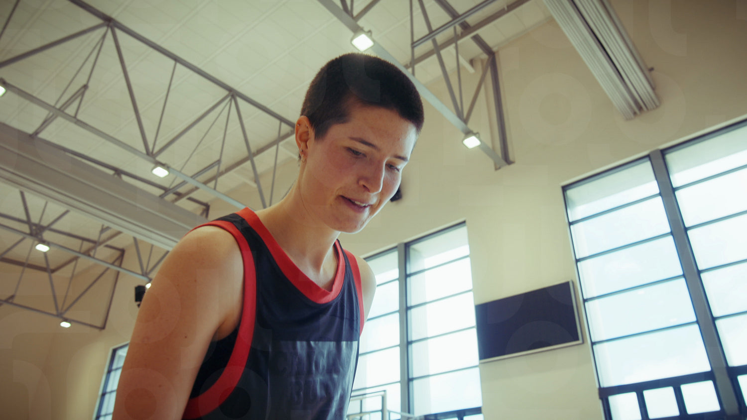 A focused young woman practices shooting a basketball in an indoor gymnasium. Her athletic determination and skill are evident during this dynamic training session, showcasing dedication to the sport.