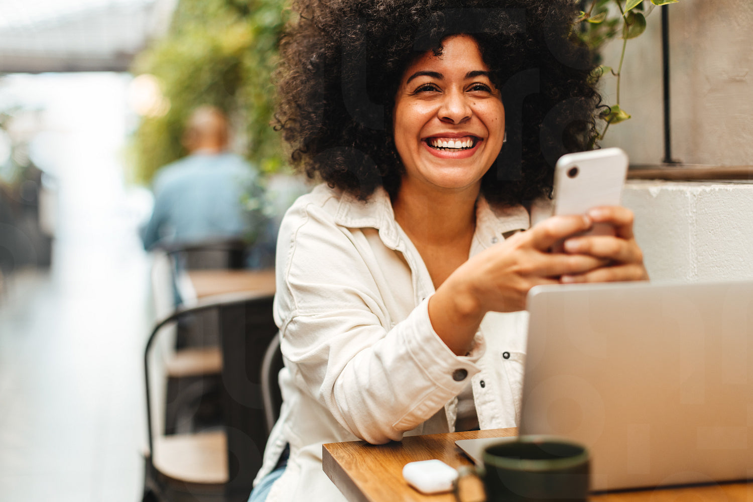 Afro haired woman sits in a cafe and uses her mobile phone to stay connected online. Happy young woman enjoying a relaxing coffee break with wireless technology.