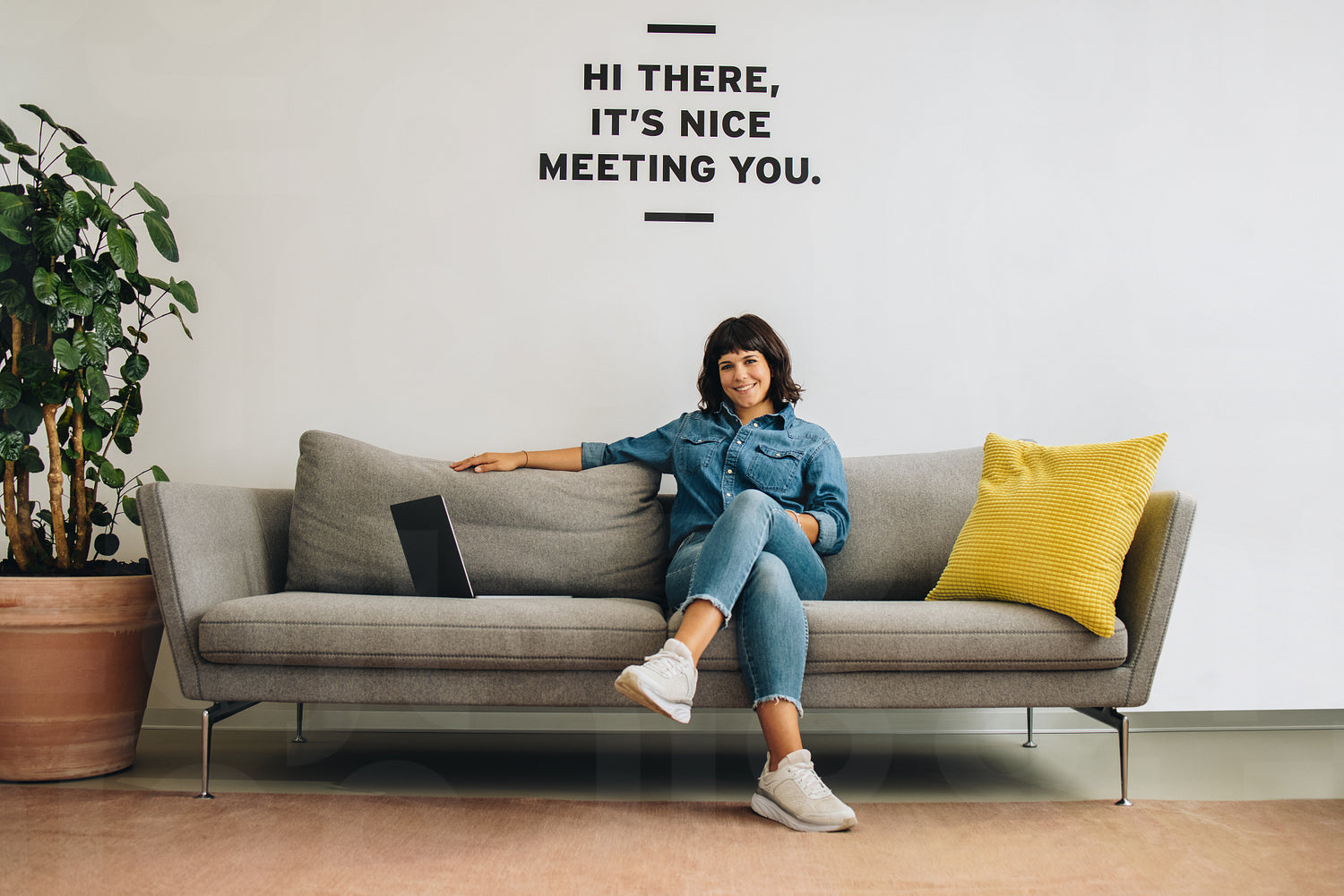 Female sitting on sofa in co-working space lobby. Woman with legs crossed on sofa in lobby.