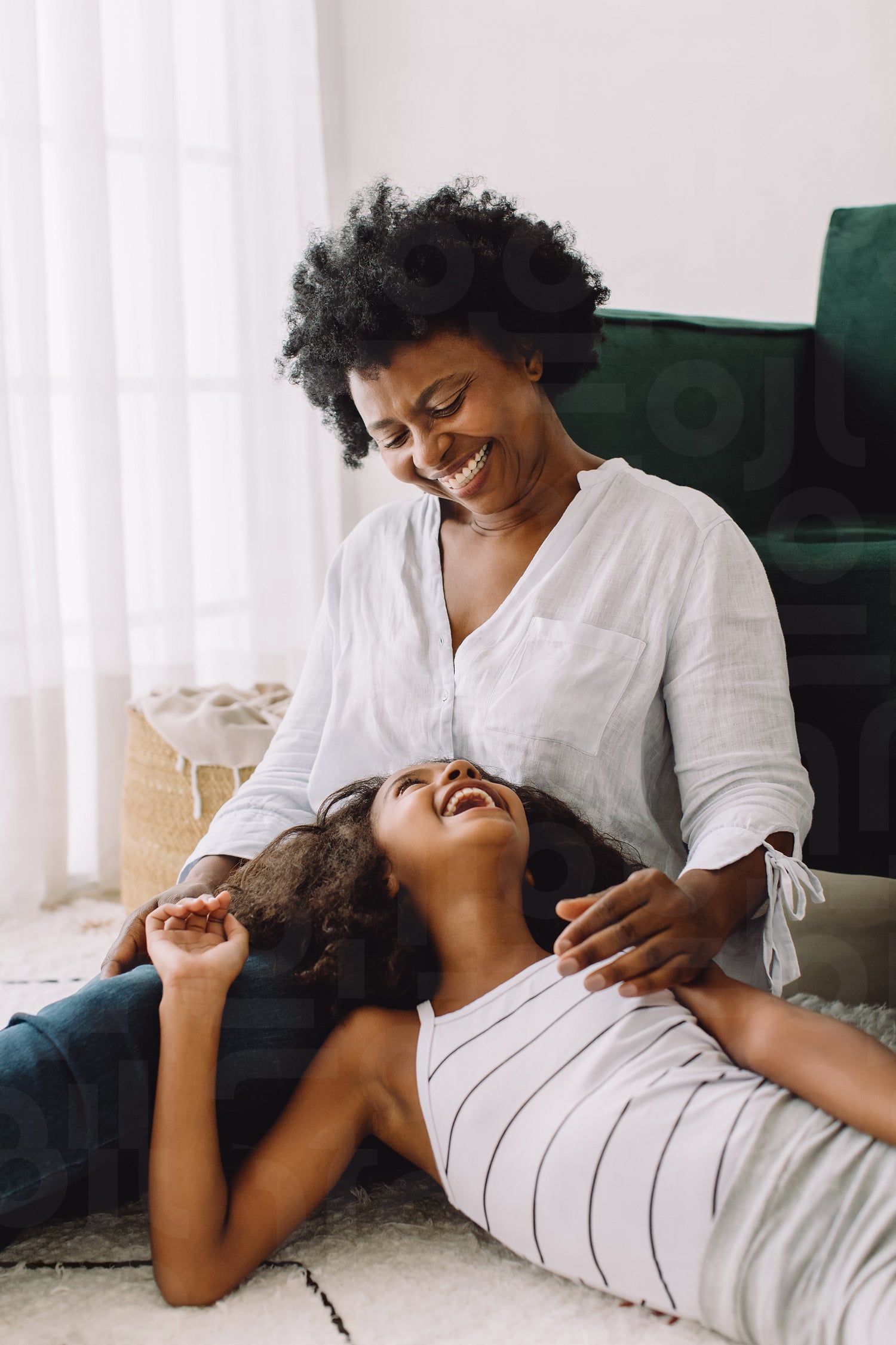 African mother and daughter having fun time together. Woman spending time with her child at home.