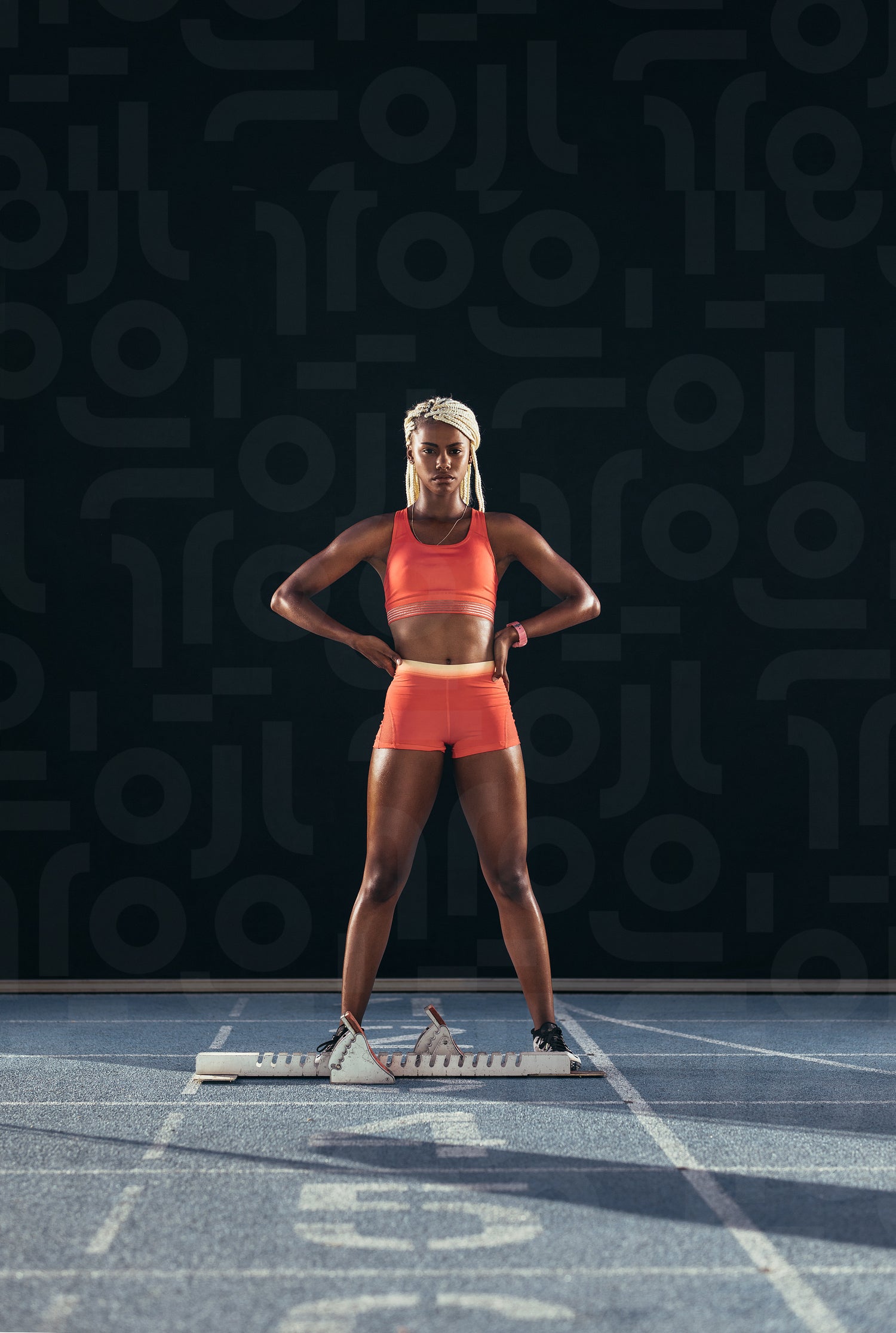 Female athlete standing beside a starting block on running track on a black background. Female runner standing at the start line on an all-weather running track with hands on hip.