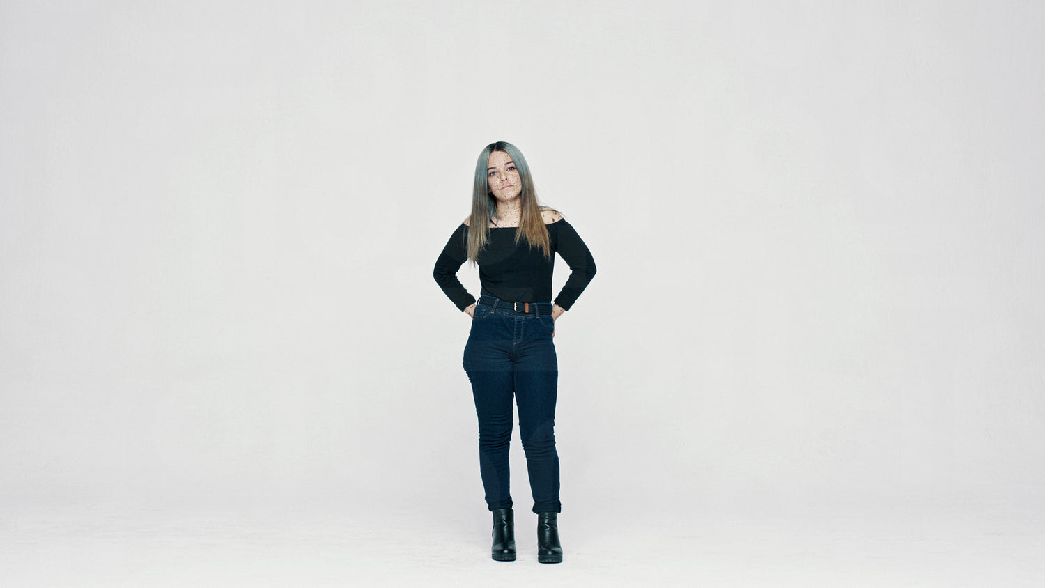 Full length of a teenage girl with dyed hair looking at camera. Woman with freckles all over her standing on white background.