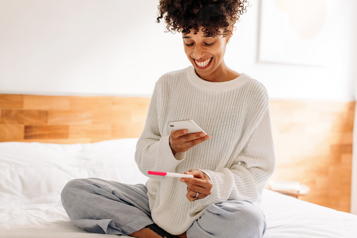 Woman taking a picture of her home pregnancy test. Excited young woman capturing her pregnancy test results with a smartphone. Woman smiling cheerfully while sitting on her bed at home.