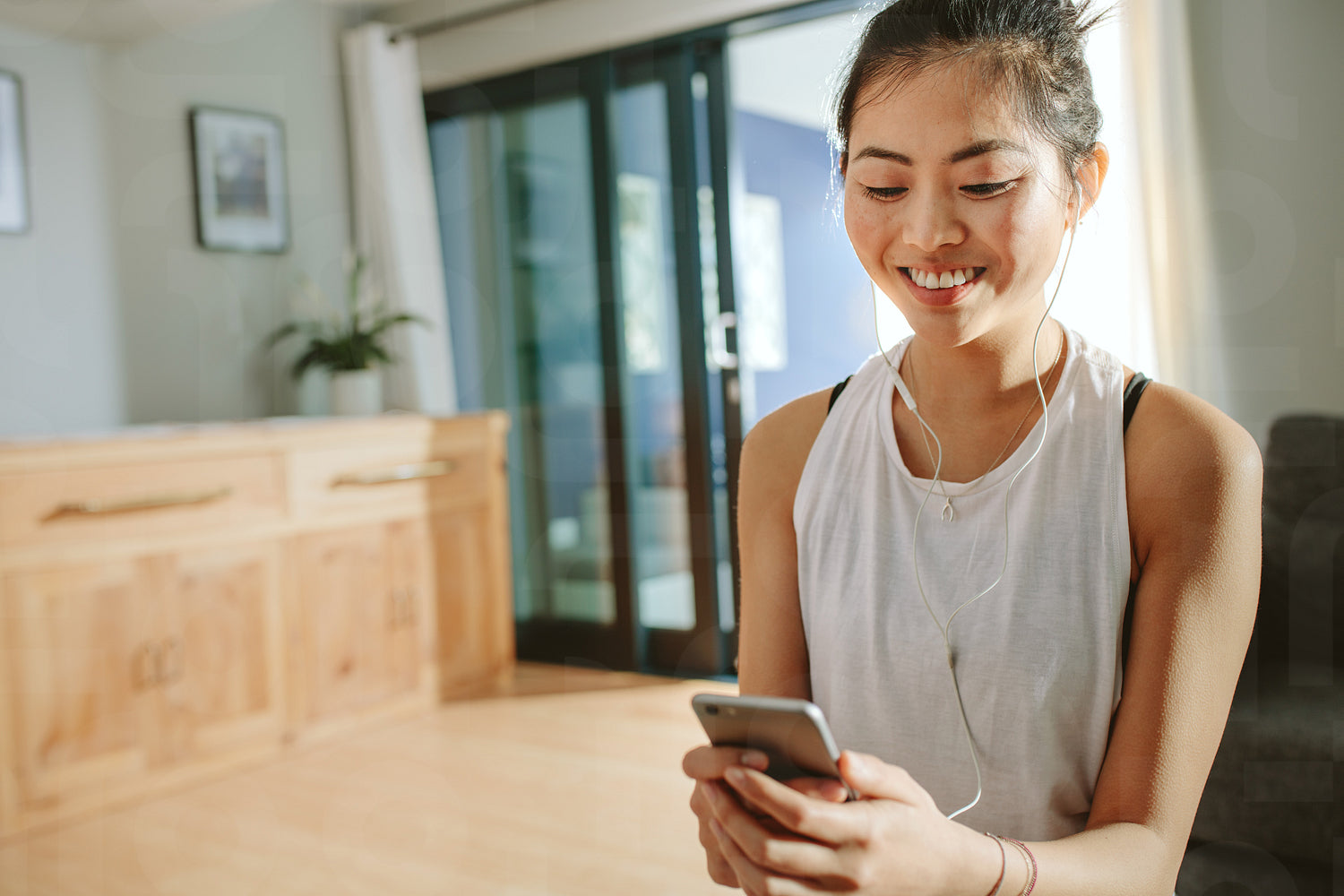 Smiling young asian woman in sports attire sitting indoors and listening to music from mobile phone. Female taking break after exercising at home.