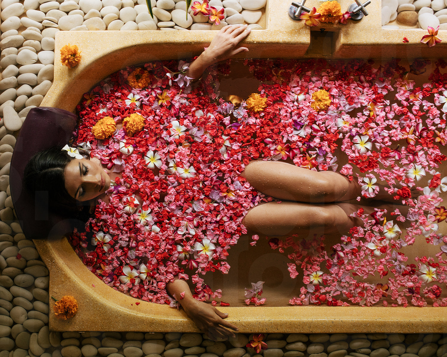 Overhead shot of woman relaxing in bathtub with flower petals. Female taking flower bath at spa center.