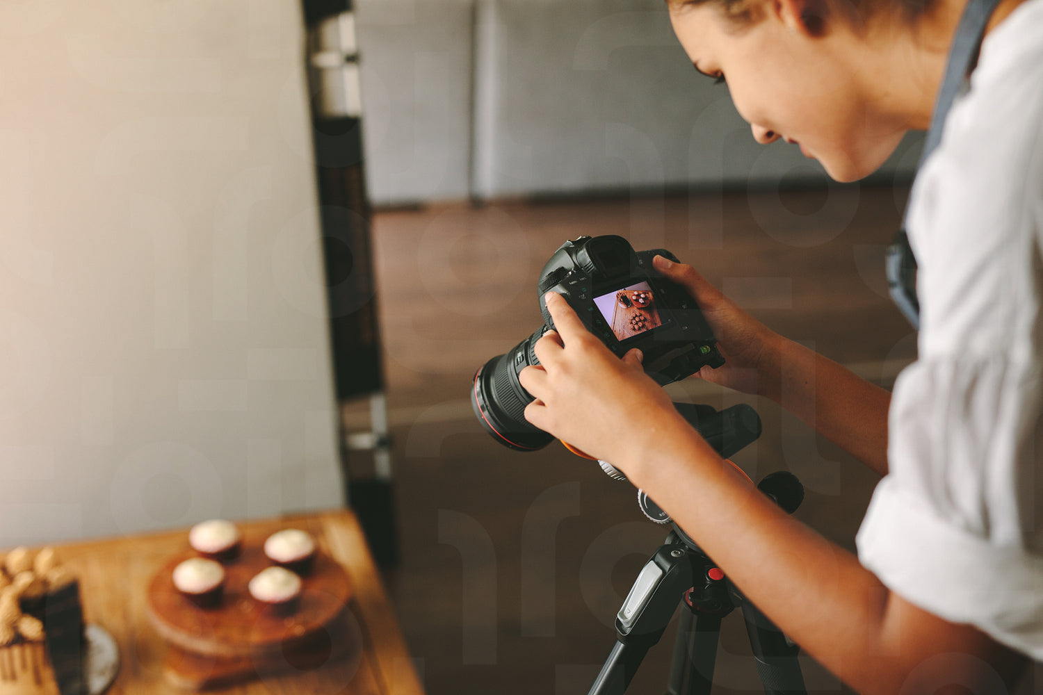Female chef taking photos for her food blog with digital camera in the kitchen. Food photographer using digital camera to take a photo of dessert.