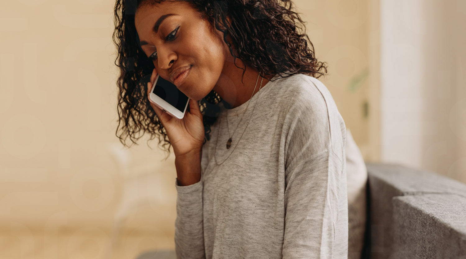 Close up of curly haired woman talking over mobile phone. Woman talking over mobile phone sitting at home.