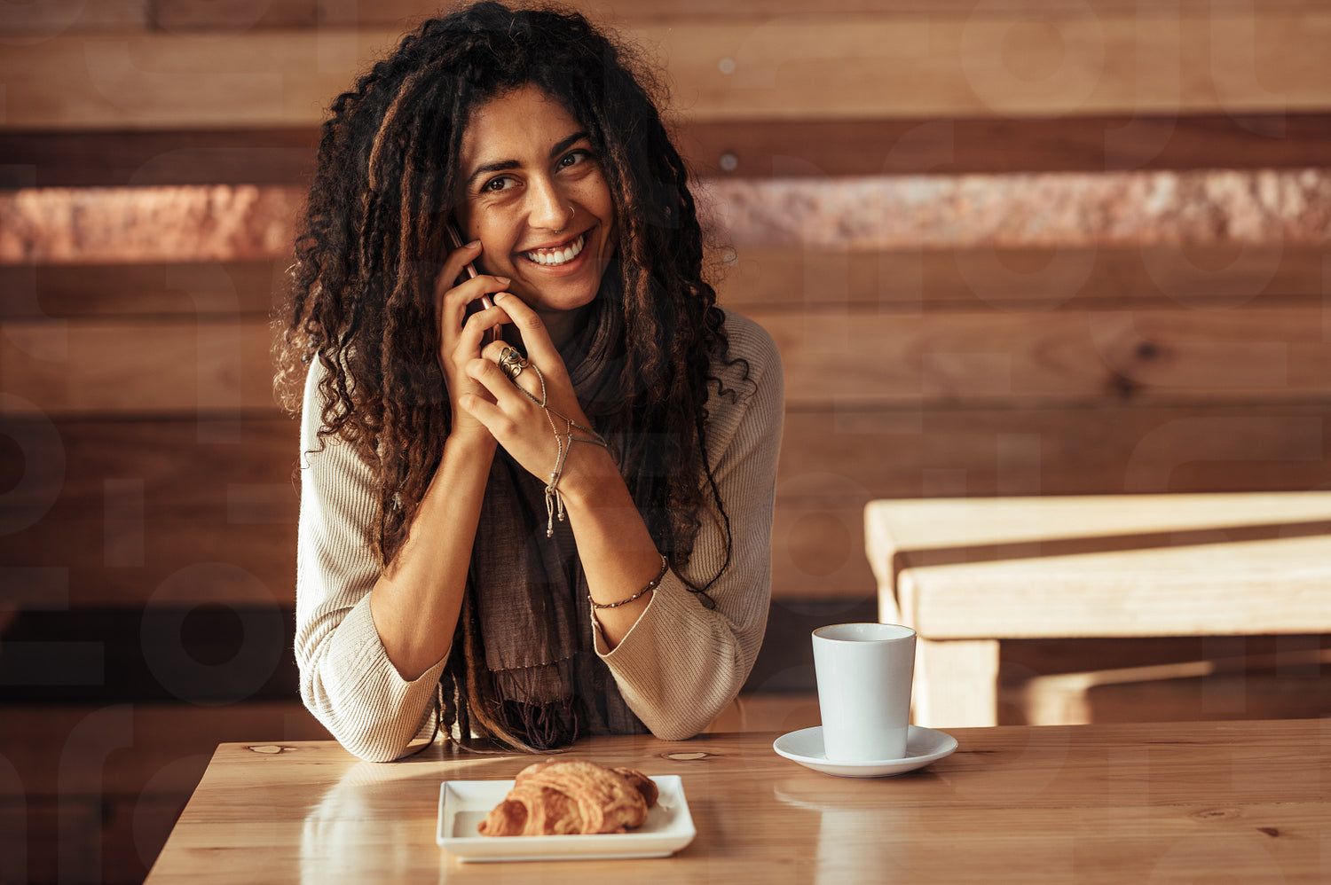 Woman talking over mobile phone at a cafe