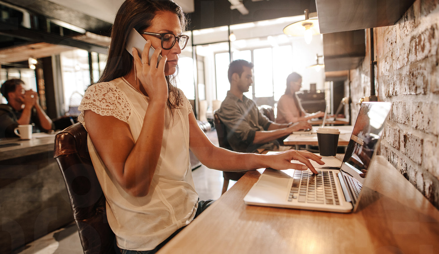 Shot of young businesswoman working on laptop and talking on mobile phone at startup office. Woman talking with client.