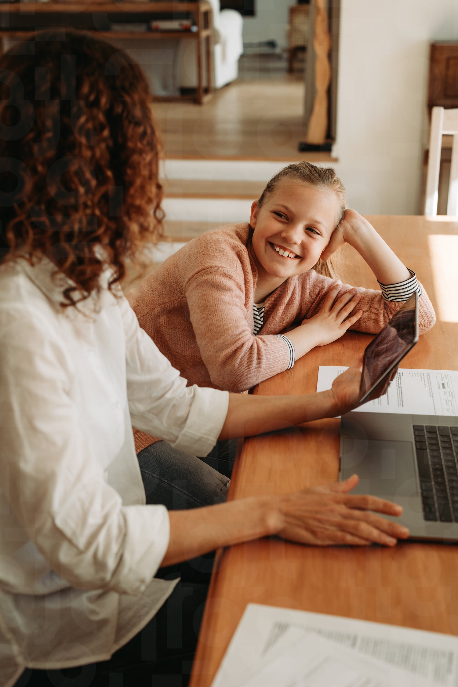 Woman talking with her daughter while working at home. Girl smiling and listening to her mother holding digital tablet.