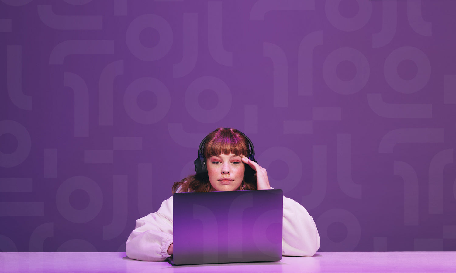 Woman with ginger hair thinking while playing an online video game on a laptop. Young gamer using an interactive streaming service in a studio.