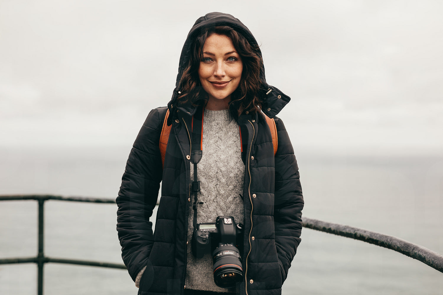 Beautiful female traveler with camera standing by railing on hilltop. Woman tourist on mountain top on a winter day.