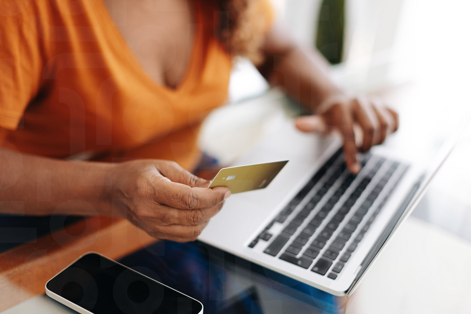 Woman using a gold credit card to make an online purchase with a laptop
