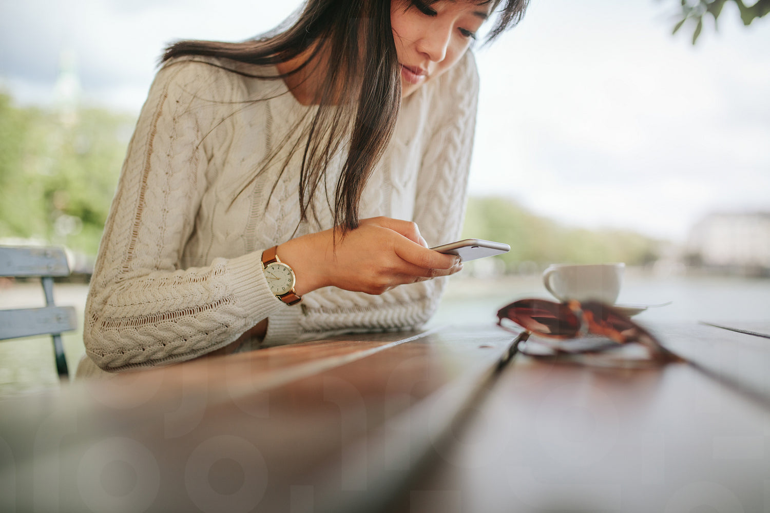 Woman typing text message on smart phone in a cafe. Image of young woman sitting at a table using mobile phone.
