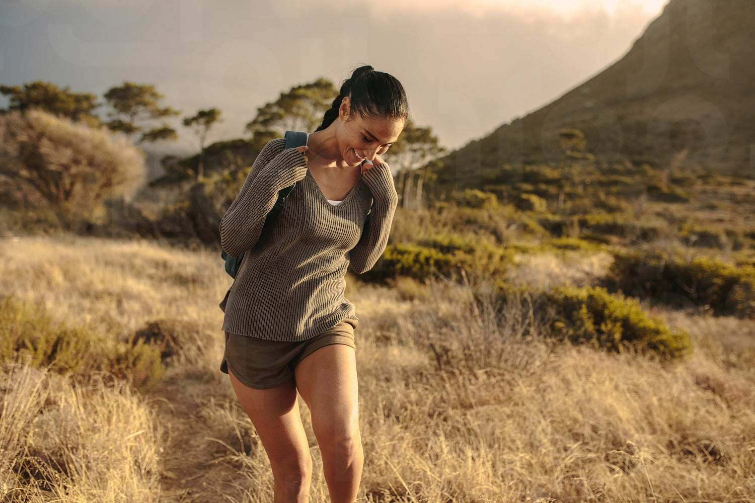 Happy woman walking down the country trail. Young female enjoying hiking in nature.