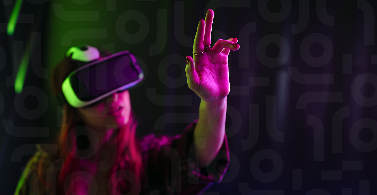 Woman wearing a VR headset, interacting with objects in the virtual world