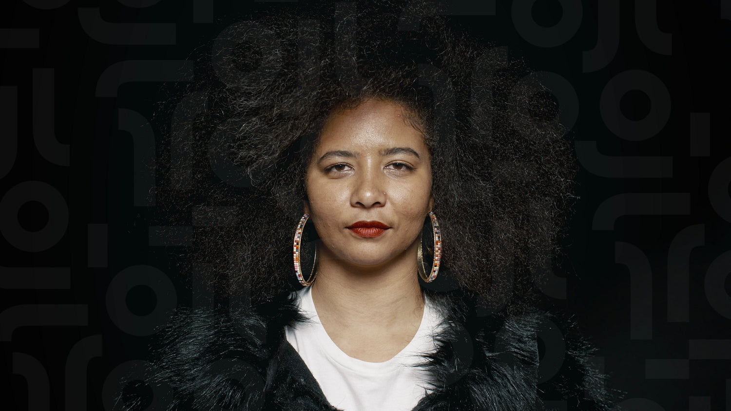 Woman with afro hairstyle smiling on black background