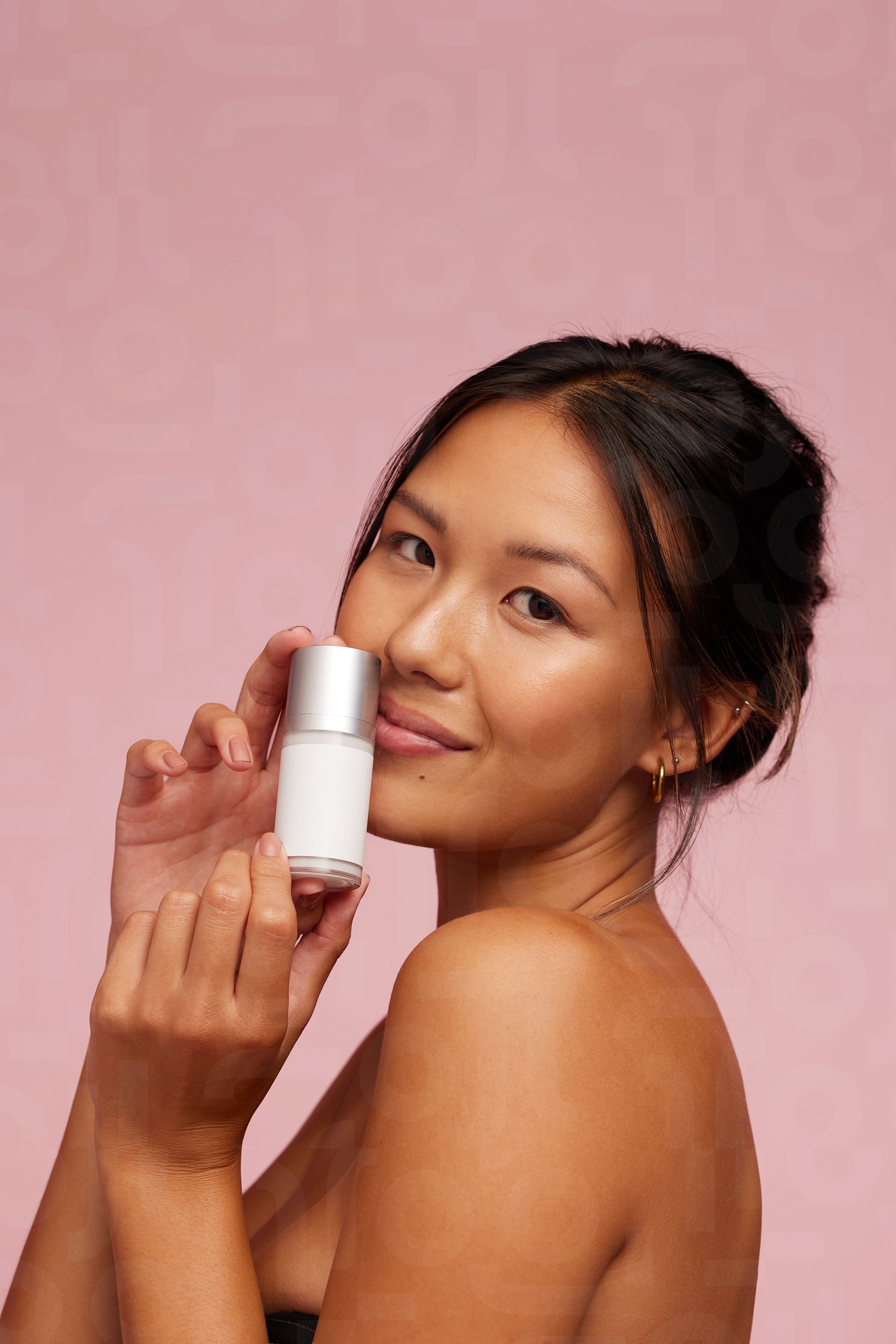 Good looking woman showing a cosmetic product to the camera. Asian woman with an effective beauty care product.