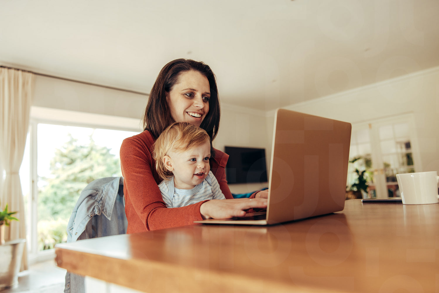 Smiling mother and baby sitting at table and working on laptop. Woman with baby using laptop while working from home.