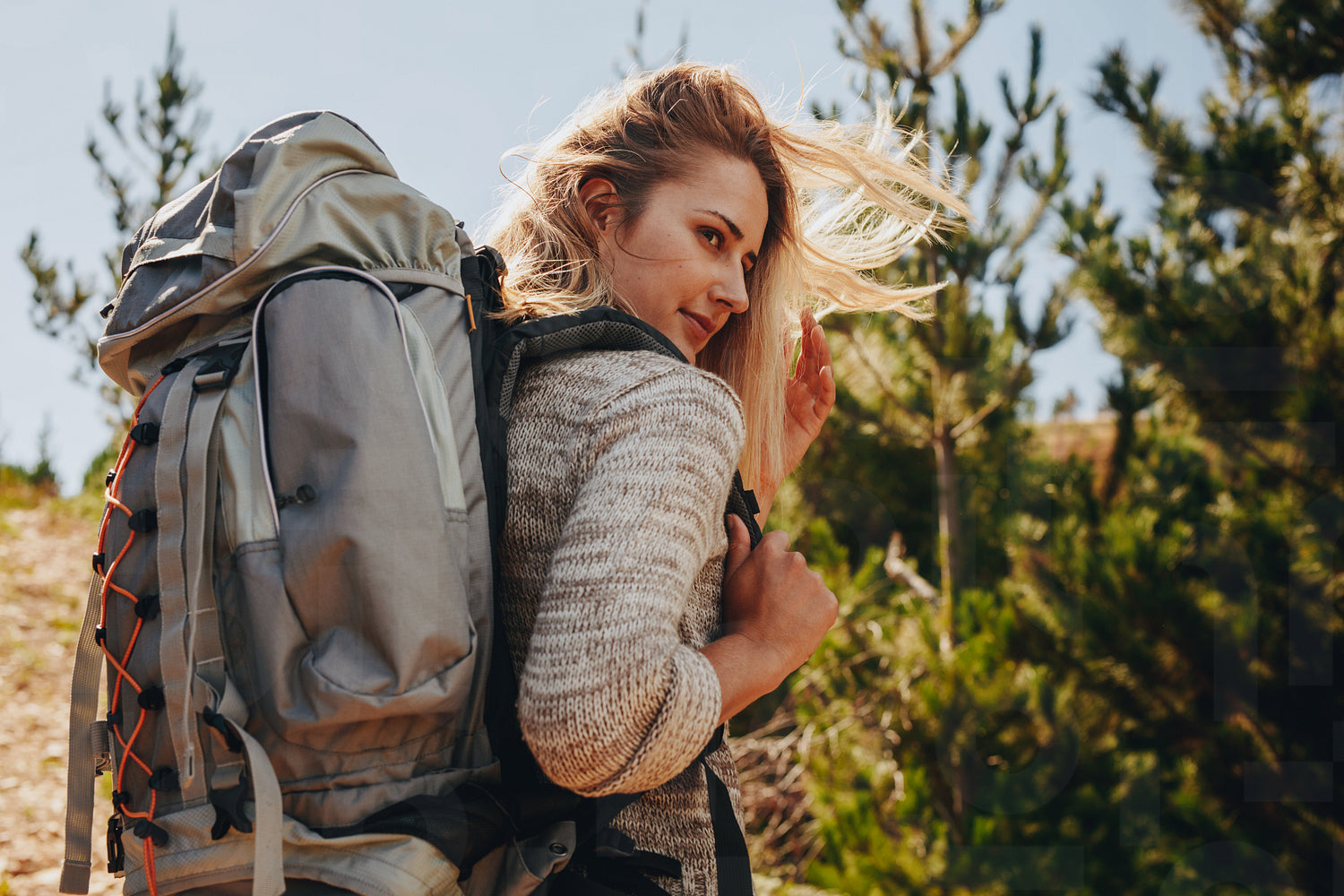 Woman with backpack on hike in nature. Female hiker on mountain trail and looking at a view.