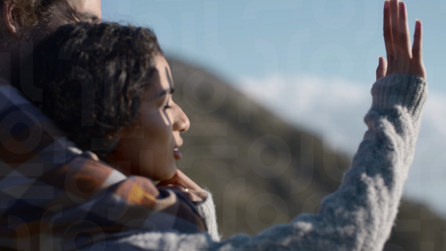 Close up of woman looking at the sun through her hand fingers while standing with boyfriend. Couple having fun outdoors.