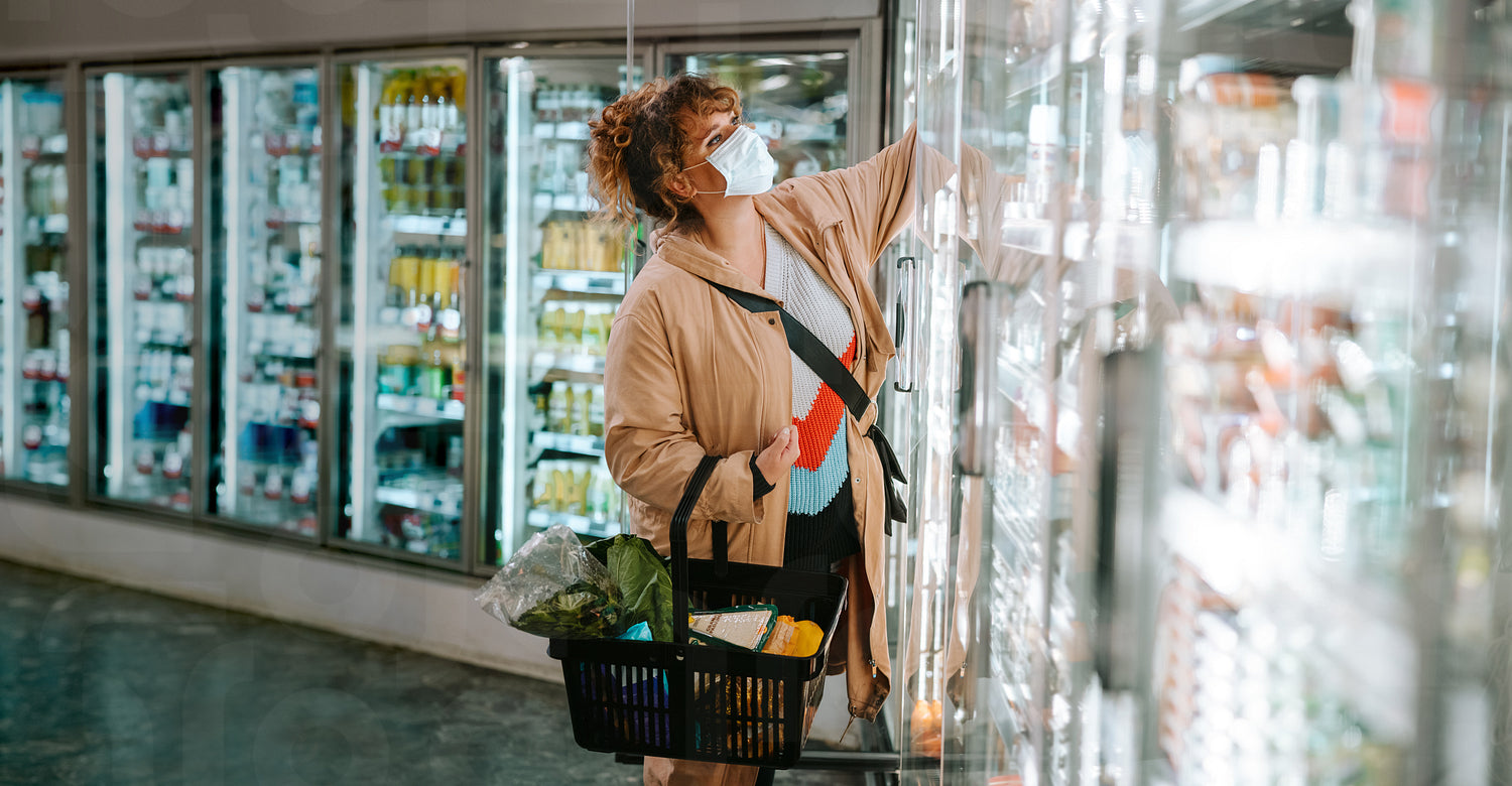 Woman picking up products from the rack store. Woman with face mask shopping groceries in supermarket.