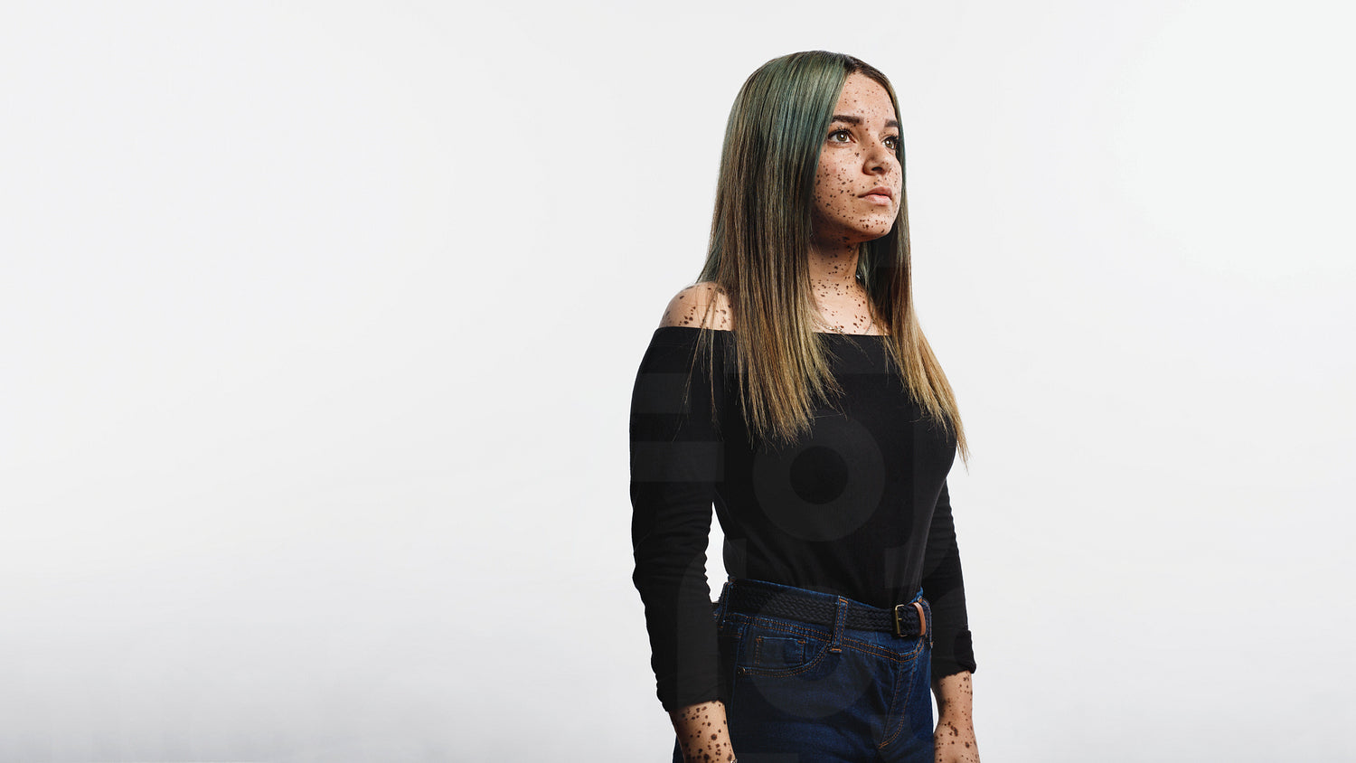 Portrait of woman with mole spots or freckles all over her body. Side view of young woman standing against white background.