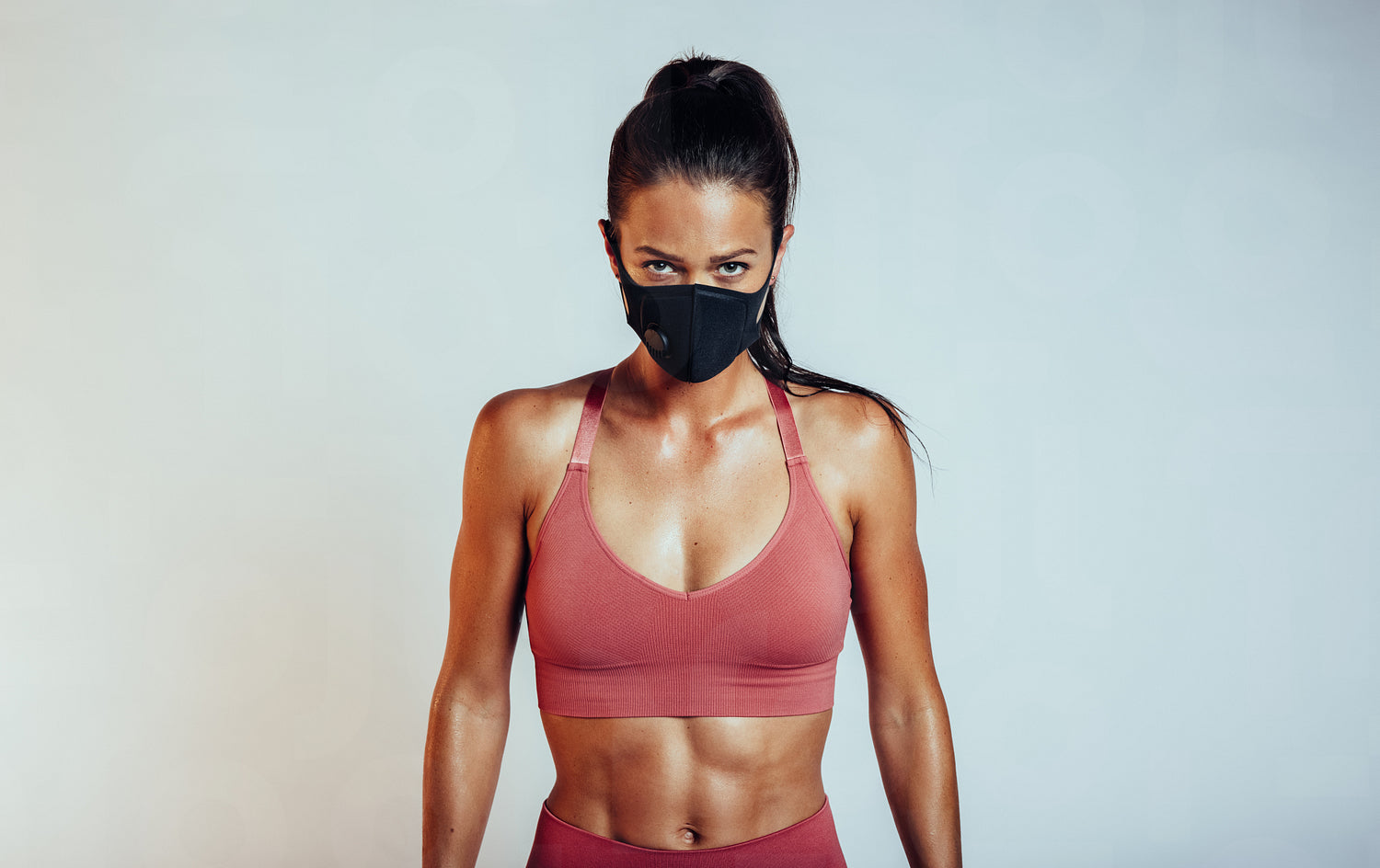 Strong woman wearing protective face mask staring at camera. Female in sportswear standing on white background.
