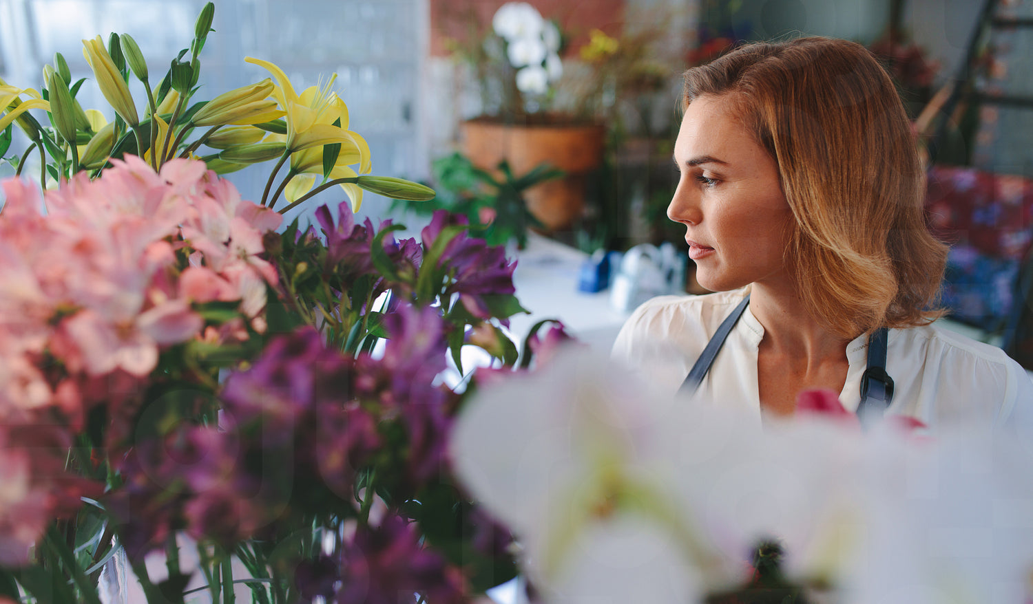 Caucasian woman working in flower shop. Female florist looking at flowers in her shop.