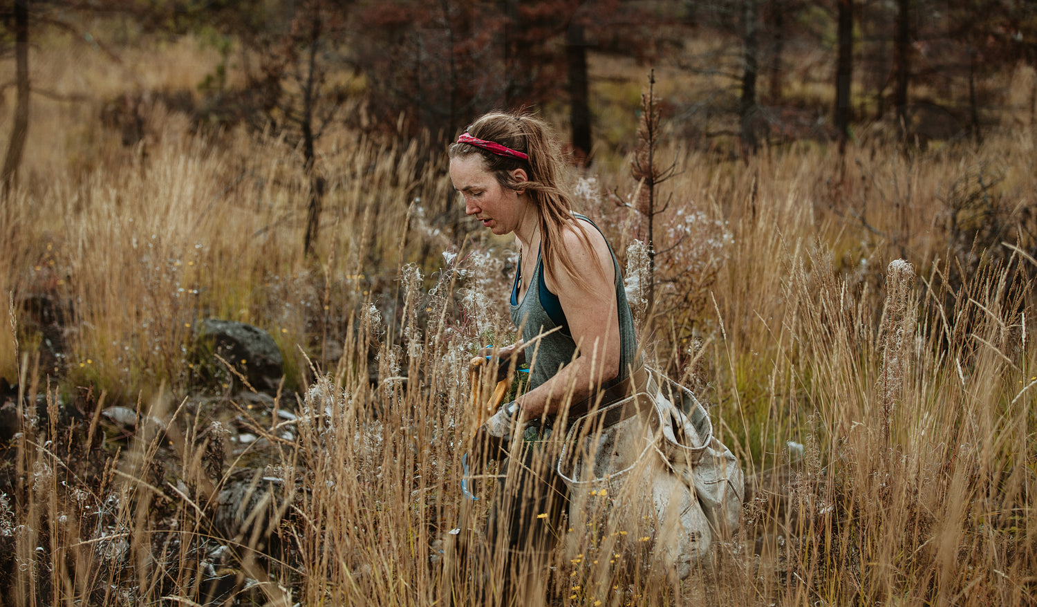 Woman working in forest to plant new trees, walking through dry grass carrying pouches of new seedlings. Woman working in forestry planting trees.