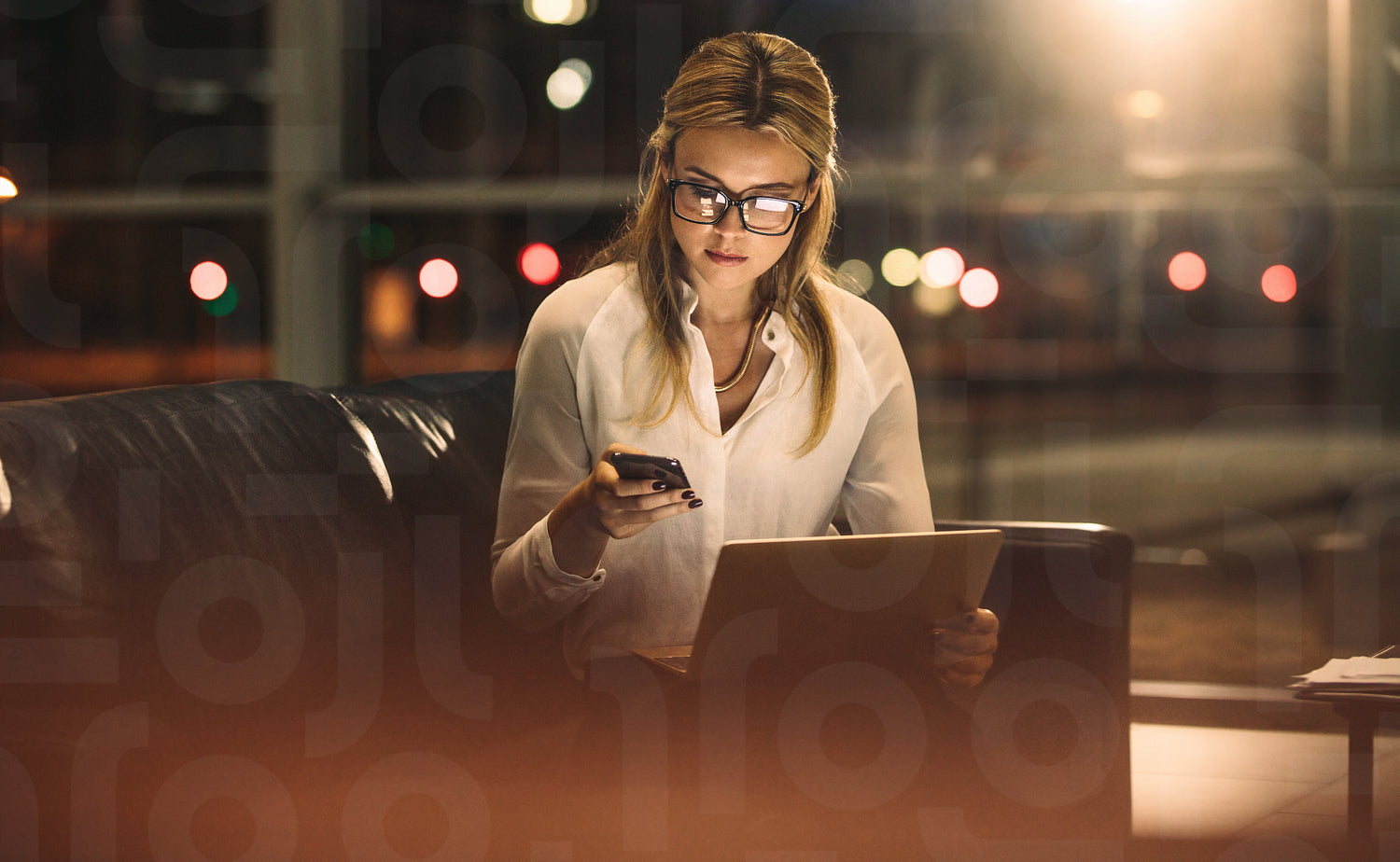Young businesswoman texting on mobile phone while working on laptop late in office. Female executive working late in office.