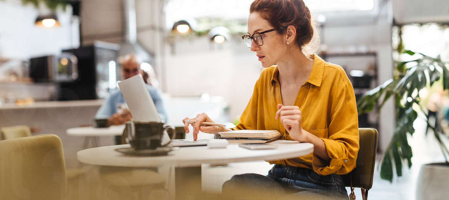 Postgraduate student works diligently on her studies at a cozy cafe. Woman using a laptop to do her research with online scholarly articles, determined to succeed in her academic pursuits.
