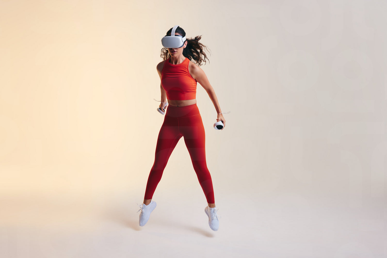 Sportswoman having a physical training session in virtual reality. Sporty young woman jumping mid air while holding gaming controllers. Active young woman wearing virtual reality goggles in a studio.