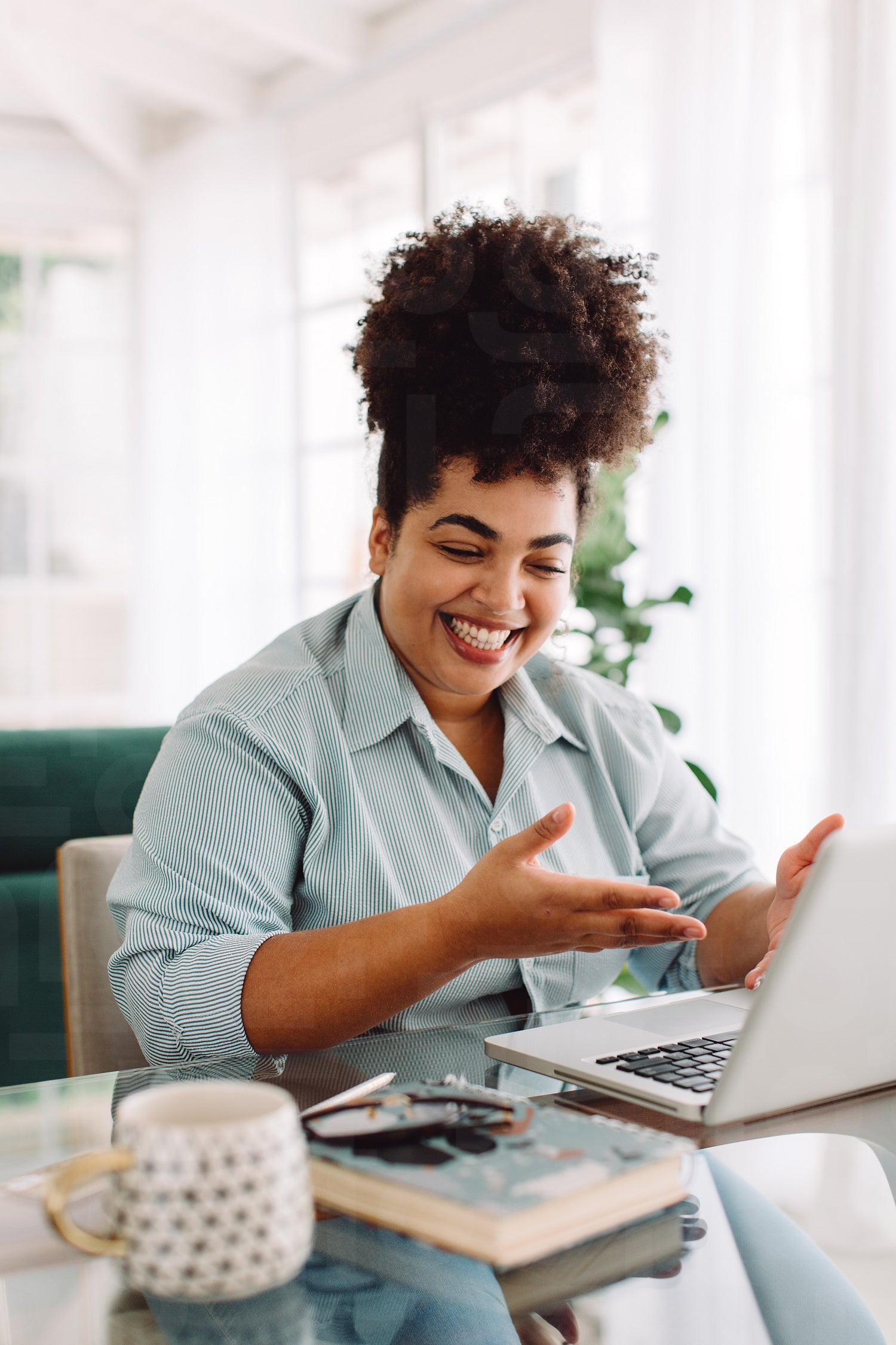 Beautiful female sitting on table and video calling on laptop. Woman video conferencing on laptop while working from home.