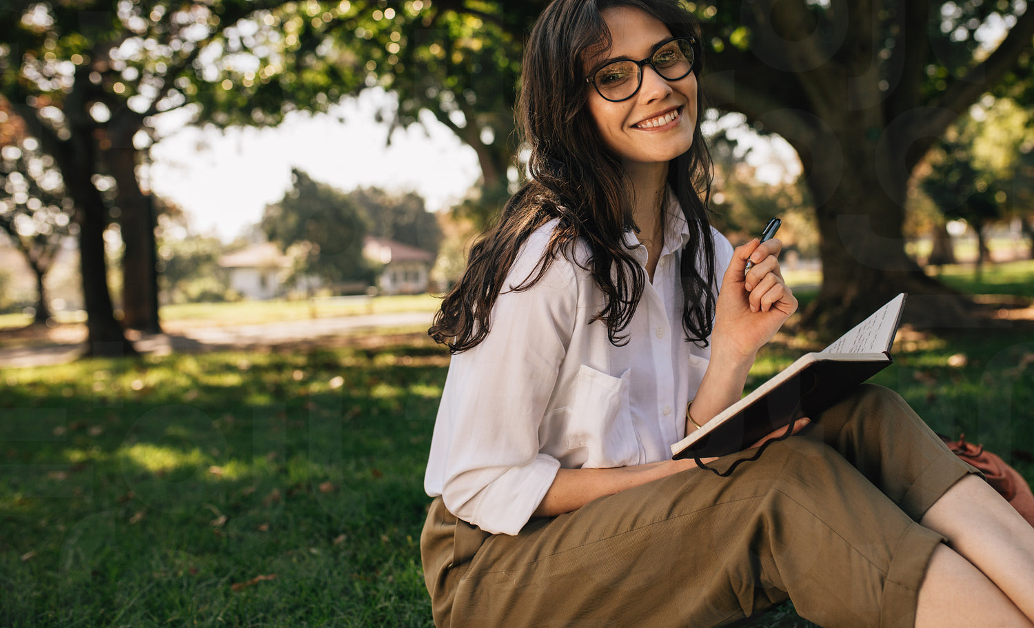 Beautiful young woman with glasses sitting at park writing in a book. Caucasian female writing in a book at park.