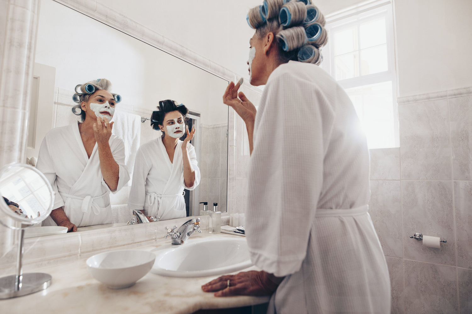 Mother and daughter in bathrobes grooming together standing in bathroom. Two women with curling rollers to hair applying cream on face.